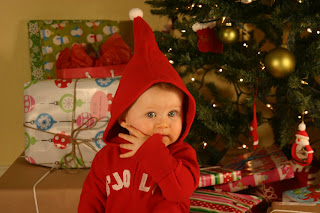 As many of you may not know, J is really into photography as a hobby. He picked up in college and unfortunately doesn't get to do it a whole lot. He had some time off around the holidays so decided to bust out the photo lights and get some pictures of Annie. We found this elfish outfit when we were out on day that said "B' JOLLY" and thought, "what more could you want?"